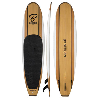 It has a two tone wood center with white rails, all covered in a silky mat fibreglass finish. This SUP has black pin stripes and timber nose and tail stops.